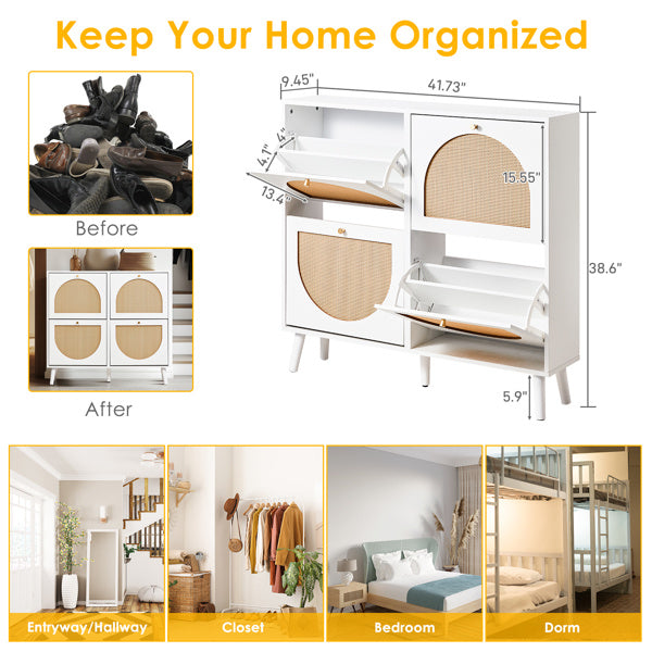 Upgrade your home with the 2-Row, 4-Tier Tipping Bucket Rattan Shoe Cabinet – where style, functionality, and smart living converge. Order yours today!