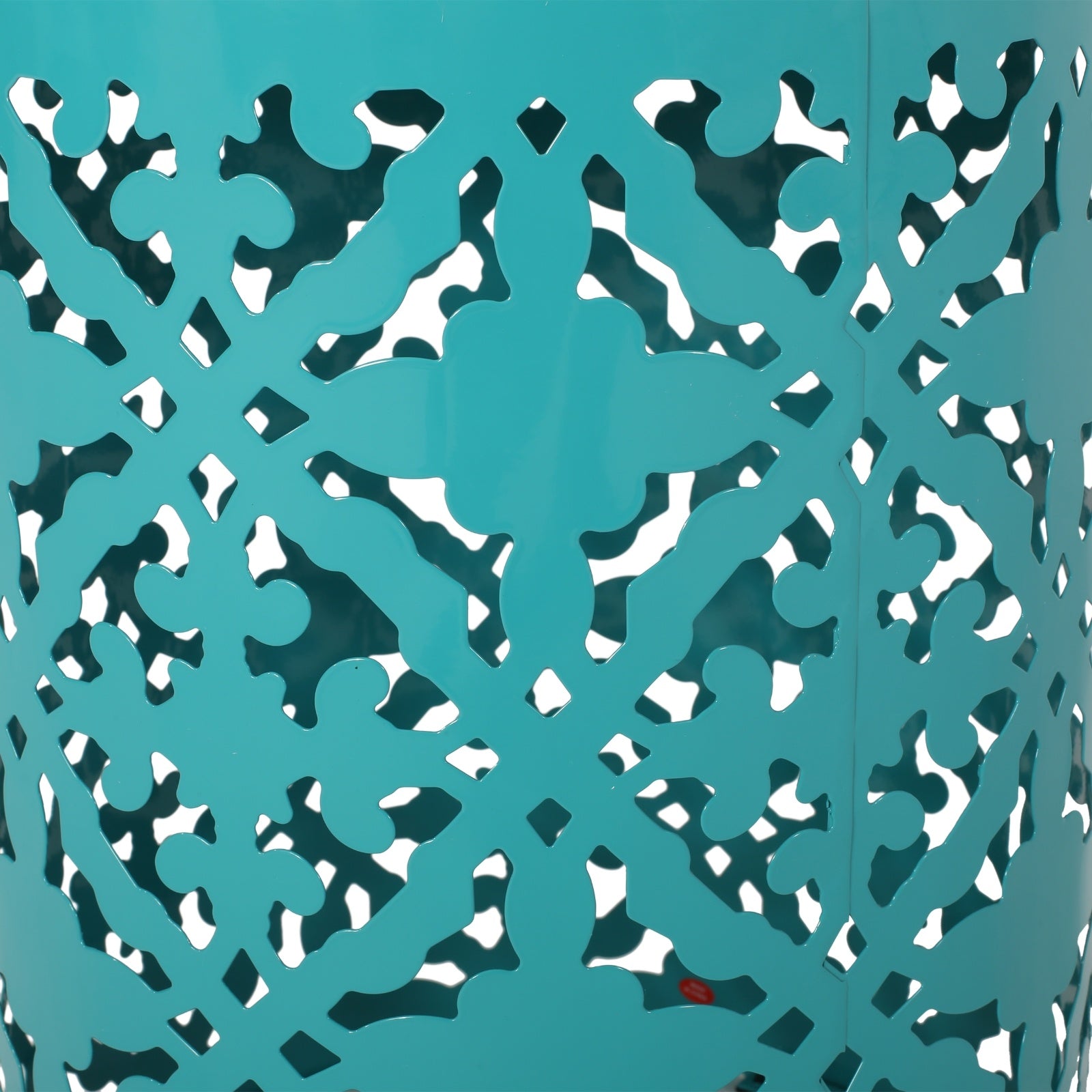 Durable iron legs feature ornate cutouts inspired by Moroccan lantern motifs, finished in weather-resistant matte black.
