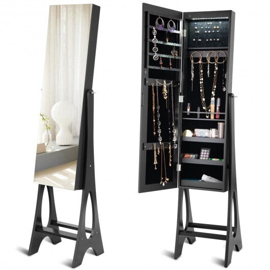 With ample storage compartments, built-in LED lighting, and a full-length beveled edge mirror, this freestanding jewelry armoire keeps your jewelry collection neatly organized, well-protected, and beautifully displayed.