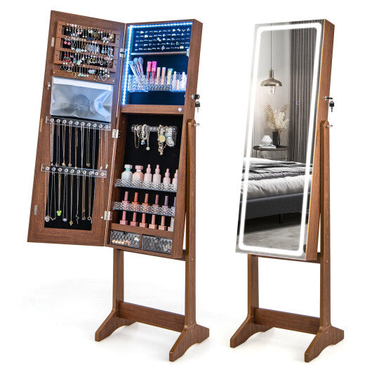 Crafted with a rich walnut finish, this floor-standing jewelry cabinet with a full-length mirror and dimmable LED lighting adds a timeless touch to any bedroom, dressing room, or walk-in closet. Whether you need to store necklaces, rings, bracelets, or cosmetics, this freestanding jewelry armoire with lock has it all!