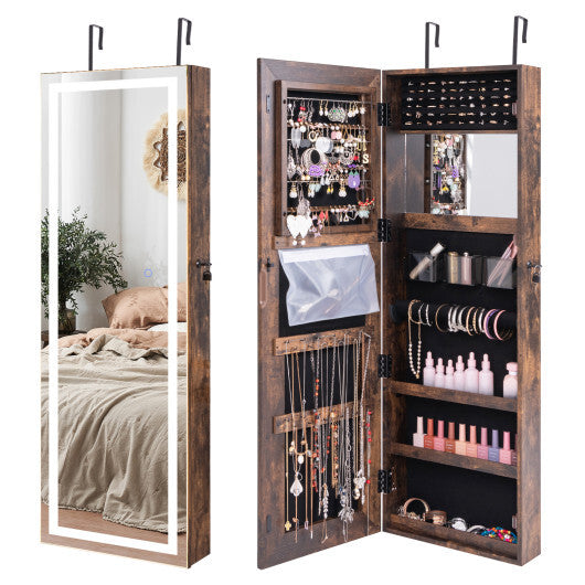 Rustic Brown Mirrored Jewelry Armoire with Full-Length Mirror & LED Lights – Stylish & Secure Storage Solution