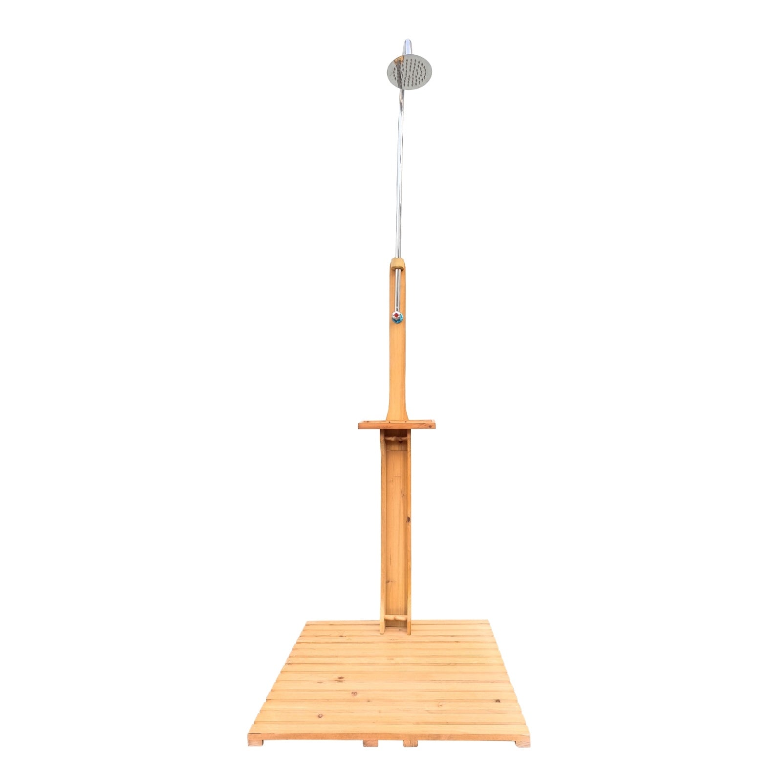 Position Cascade at your pool’s edge for seamless rinse-off between swims. The teak platform keeps feet dry underfoot. -