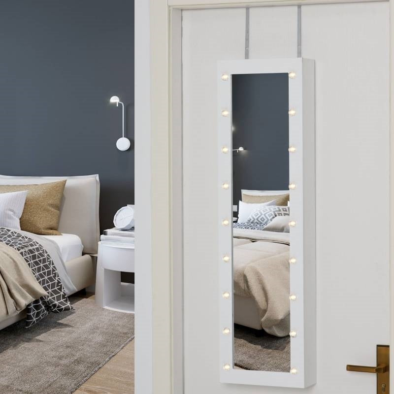 White Door/Wall-Mounted Jewelry Armoire Cabinet with Mirror and LED Lights