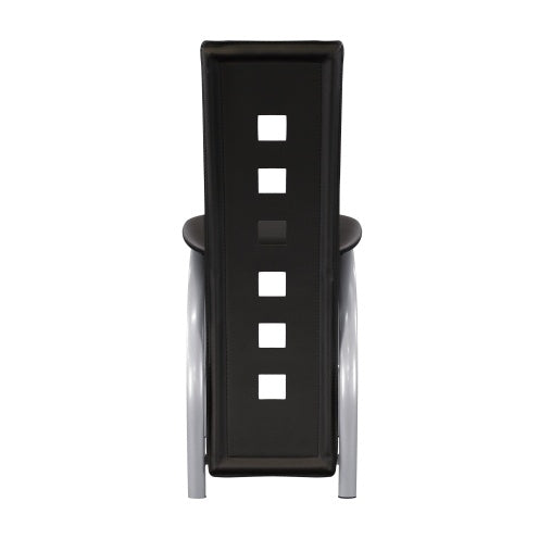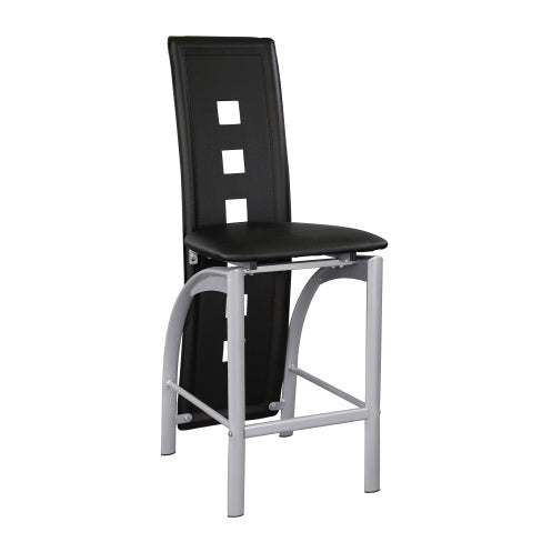 Ultra-modern styling is executed flawlessly in the design of the Sona Collection. Immediately drawing your attention and providing stylistic drama to the casual dining group is the silver finished metal legs and elongated cut-away black faux leather backs of this counter height chair.