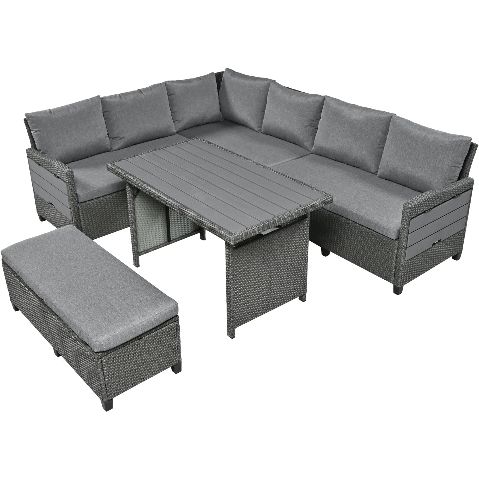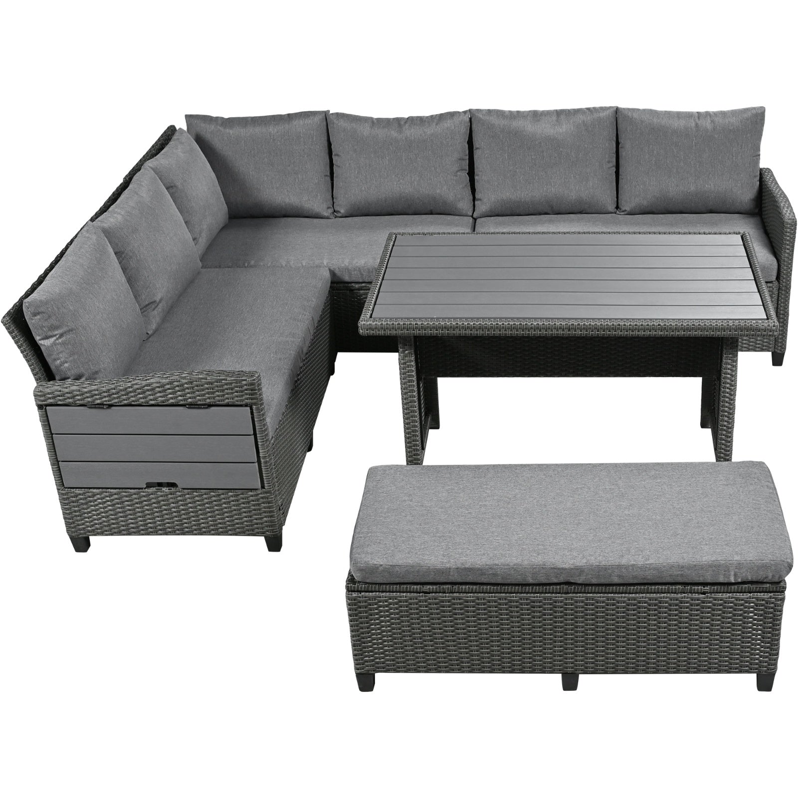 TOMAX 5-Piece Outdoor Patio Rattan Sofa Set, Sectional PE Wicker L-Shaped Garden Furniture Set with 2 Extendable Side Tables, Dining Table and Washable Covers for Backyard, Poolside, Indoor, Gray
