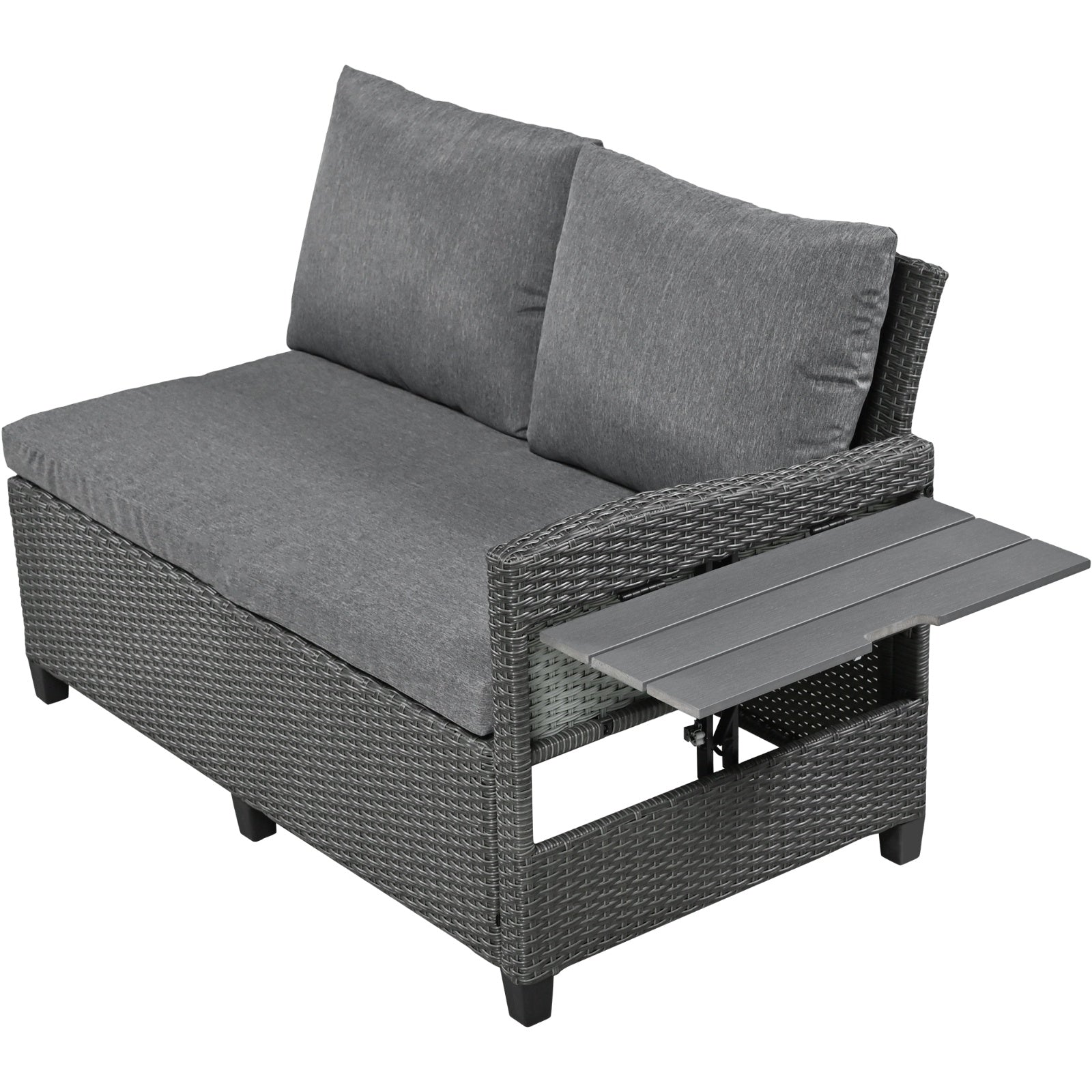 With 2 loveseats with side tables, 1 corner sofa, 1 long bench and 1 dining table, this 5pcs rattan sofa set can comfortably seat 7 people while the spacious table is perfect for placing food and drinks. Adjustable feet under table will make it level and stable as much as possible.