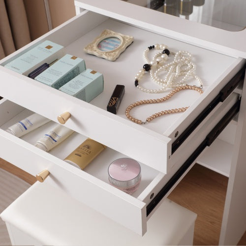 Transform your beauty routine with our premium Vanity Desk with Lighted Mirror. Designed for elegance and functionality, this modern makeup station combines a sleek glass desktop, multiple storage options, and an adjustable LED mirror, bringing a luxurious touch to any bedroom or dressing area.