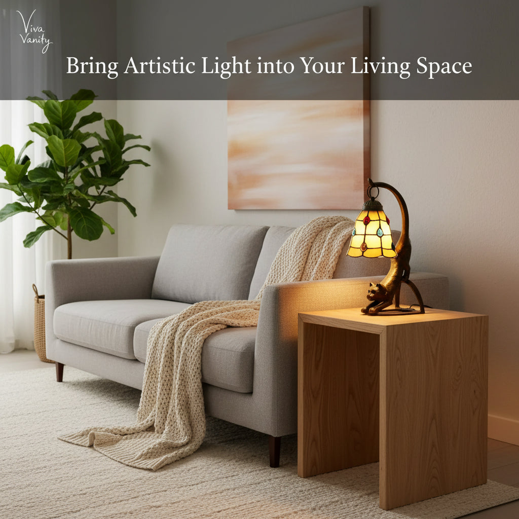 The Viva Elite Artisan Cat Table Lamp orchestrates a multi-sensory experience that elevates the everyday into the extraordinary. As light filters through the hand-cut art glass, it creates a warm, honey-toned glow that transforms harsh overhead illumination into a layered, sophisticated lighting scheme with vintage charm and whimsical personality.